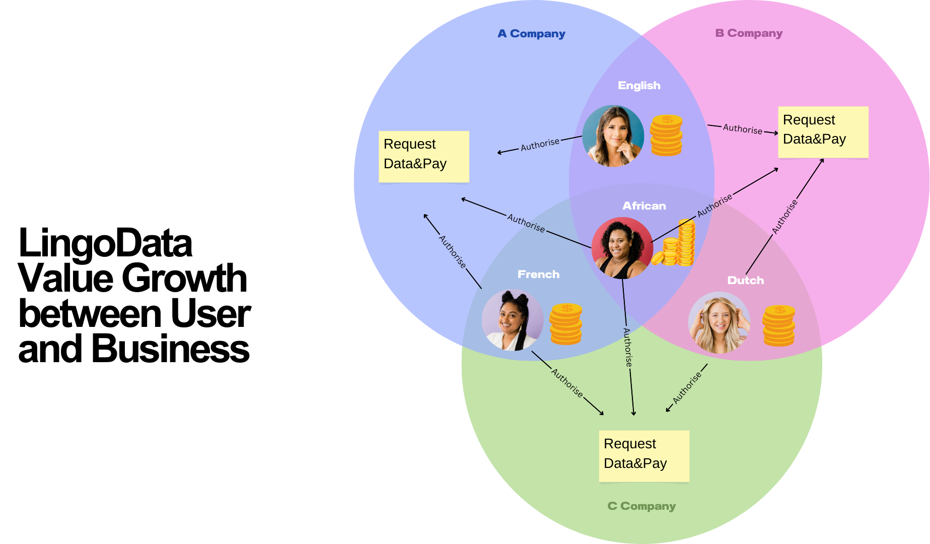 2. **Web3 Incentives** – Contributors are rewarded in **$LINGOAI tokens** or stablecoins upon the authorisation to several parties of their data , ensuring transparent and verifiable compensation.